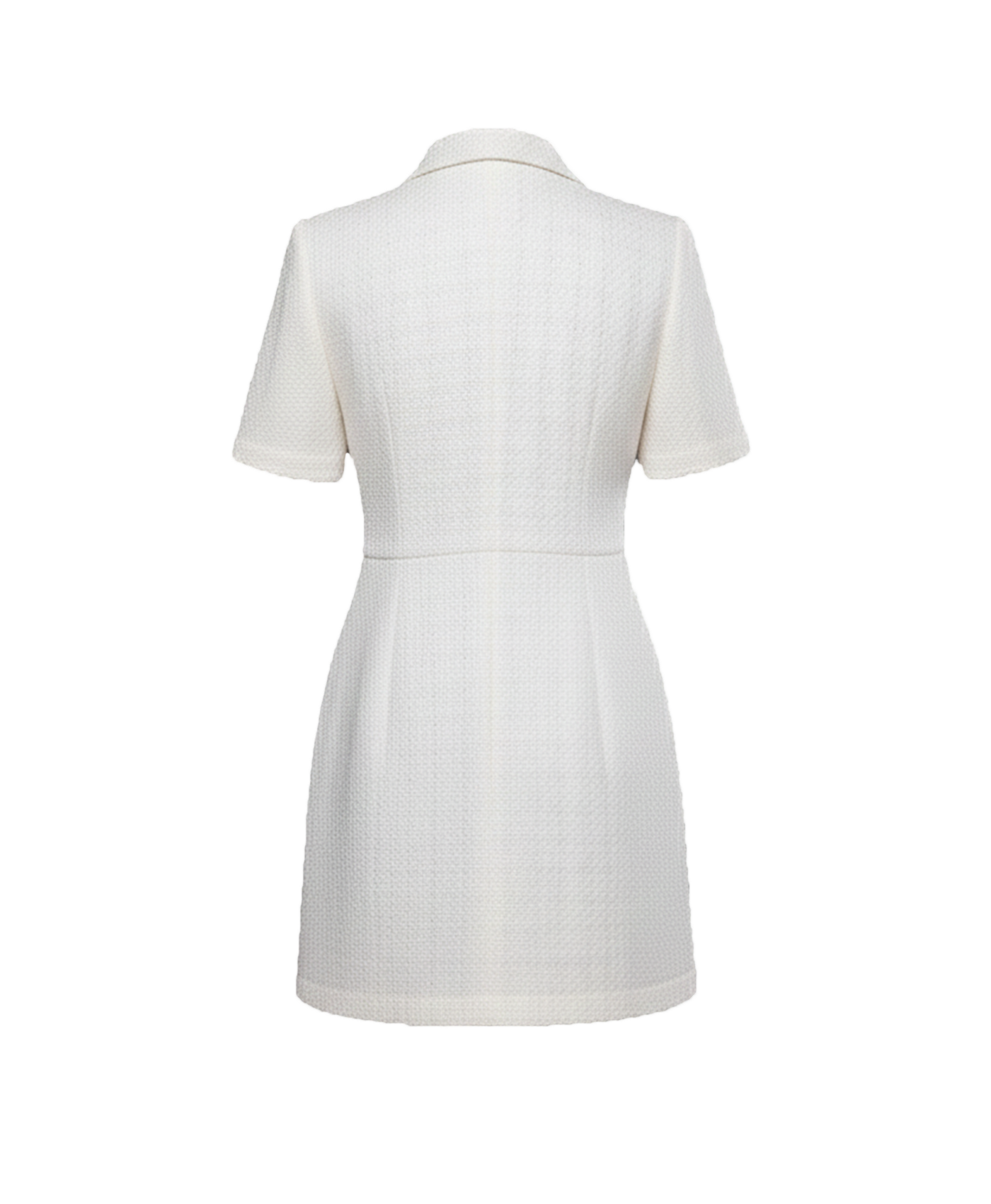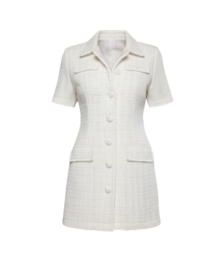 Дизайнът включва класическа яка и къси ръкави, които придават завършен и изчистен силует. Закопчаването с едри копчета отпред в същия цвят подчертава женствената линия, а декоративните джобове с капачета добавят елегантен акцент. Дължината е модерна и подходяща както за делови срещи, така и за специални поводи.